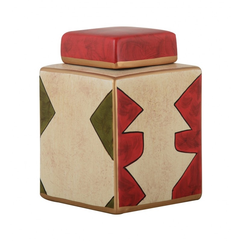 A refined sculptural jar defined by clean geometry and a rich, textured glaze in red, gold, and green tones. The surface reveals subtle variations in light and depth, giving the piece a quiet sense of movement and character. Designed for modern interiors, it works effortlessly as a standalone accent or styled with minimal floral arrangements.