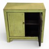 This compact storage piece features a rich, saturated green finish with a visible wood grain texture that adds depth to its clean-lined silhouette. Designed with a double-door cupboard and traditional dark circular hardware, the cabinet offers a sophisticated way to introduce a pop of color while maintaining a classic, grounded feel in any entryway or living space.
