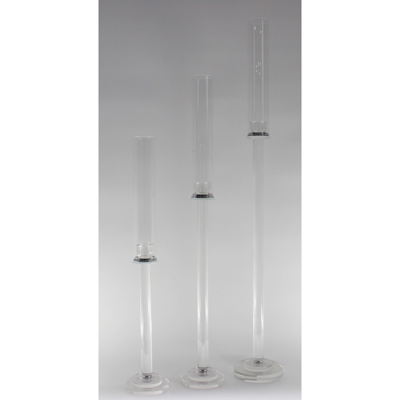 A set of three crystal candle holders with a clean, simple silhouette and smooth, transparent form. Their clarity enhances the natural glow of candlelight, creating a soft, elegant atmosphere. Perfect for styling together as a centerpiece or separately throughout a space, they bring a refined, understated luxury to any interior.