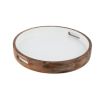 This circular wooden serving tray features a crisp, glossy white enamel interior that creates a fresh and modern look. The natural wood exterior provides a warm, rustic contrast, while the integrated cutout handles make it easy to carry from the kitchen to the table.