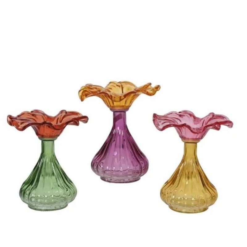 Add a touch of personality to your space with these eye-catching glass vases. Designed with a fluted rim and textured ribbed body, each piece glows in vibrant translucent tones. Their sculptural shape and vintage flair make them a perfect statement accent for modern or classic décor.