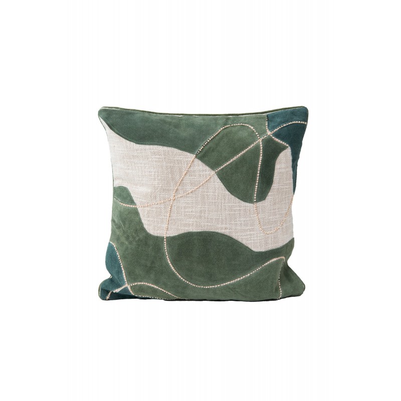 COTTON CUSHION COVER WITH SUEDE LEATHER PATCHWORK AND HAND EMBROIDERY
