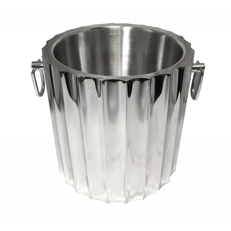 A stylish champagne cooler with a ribbed design and polished nickel finish, complete with side handles for easy handling. Its bold shape and smooth shine give it a clean, contemporary look.