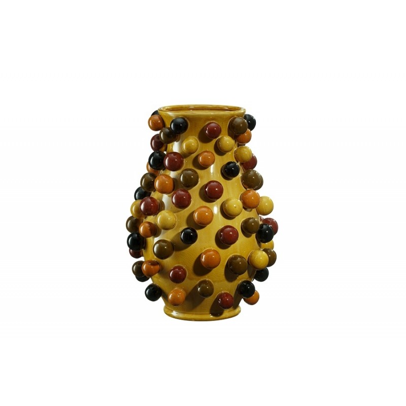 Mustard ceramic vase adorned with brown, maroon, and yellow ceramic spheres arranged across its exterior surface, creating rich visual depth from every angle.