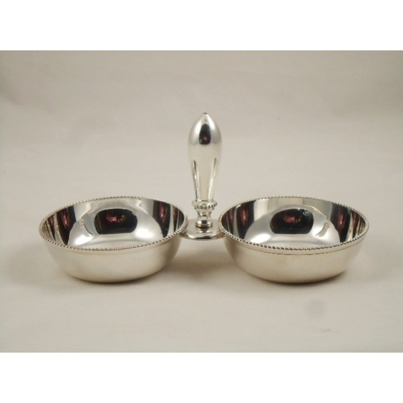 A peanut serving bowl featuring two connected compartments joined at the center, crafted in a polished metallic finish. Designed with a sleek, high-end aesthetic, it combines functionality with sculptural elegance, making it ideal for serving and stylish presentation.