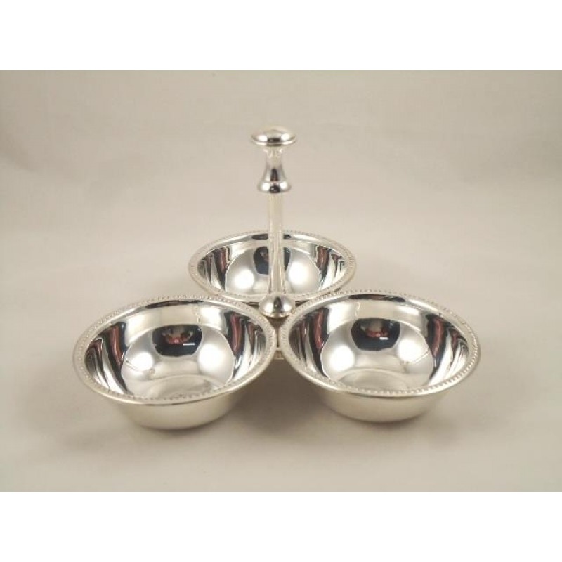 A serving bowl with three connected compartments joined at the center, crafted in a silver-plated finish. Designed with a sleek, high-end aesthetic, it combines practicality with sculptural elegance, making it ideal for stylish presentation and versatile use on any table.