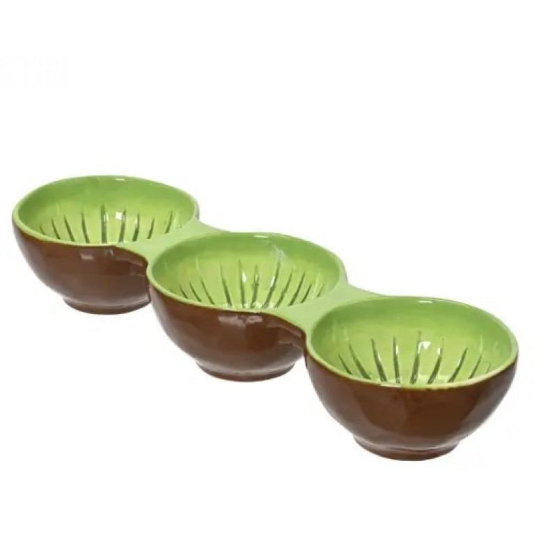 Serve tapas in style with this kiwi-inspired triple server. Featuring three connected ceramic bowls with a textured brown exterior and vibrant green interiors, this playful piece is perfect for dips, nuts, or appetizers.