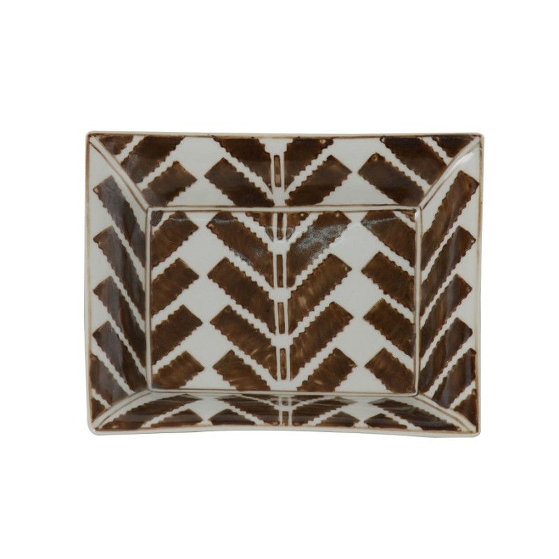 A refined ceramic ashtray featuring a geometric pattern in warm beige and brown tones, creating a balanced, natural aesthetic with subtle visual depth.