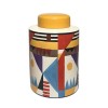 Crafted in fine ceramic, it features a bold geometric pattern with contrasting tones, blending modernist influences with tribal-inspired graphic elements to create a strong yet balanced visual presence.