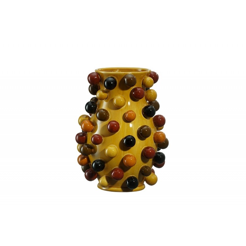 Mustard ceramic vase adorned with brown, maroon, and yellow ceramic spheres arranged across its exterior surface, creating rich visual depth from every angle.