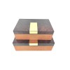 This set of decorative wooden storage boxes combines a dark wood veneer top with a textured woven lower section, creating a refined contrast of materials and finishes. A minimalist gold-tone metal accent on the lid adds a subtle touch of elegance.