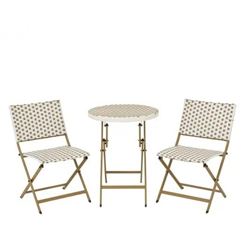 The Bellano Wicker Outdoor Set includes a round folding table and two matching chairs with a woven wicker-style design and slim metal frames. Its airy design and refined finish bring a clean, contemporary look with a subtle classic touch.
